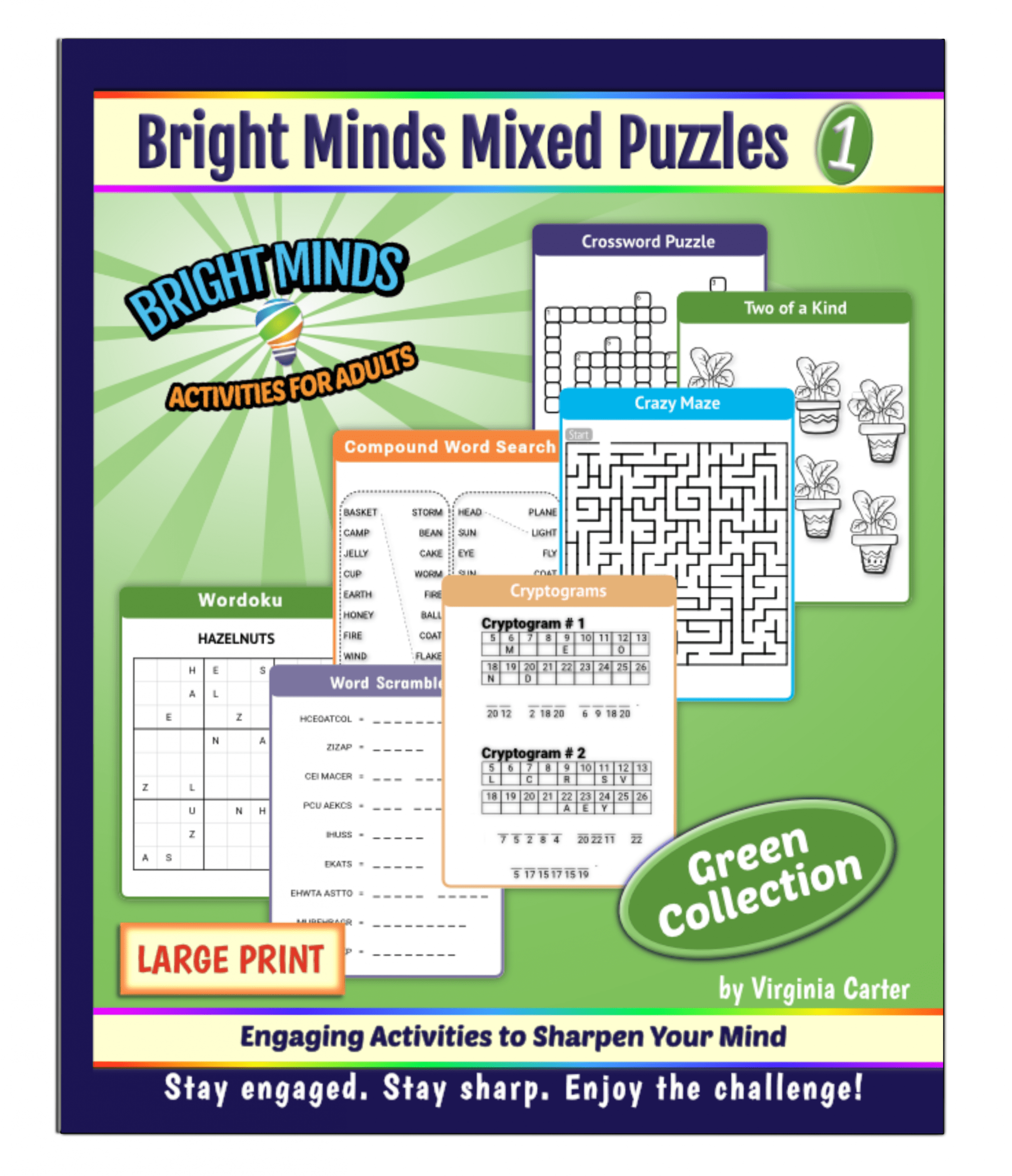 The Color Collections in the Bright Minds Activities for Adults series offers tailored activities designed for specific levels of memory, focus, and concentration abilities. Each color-coded collection reflects a unique level of engagement, ensuring you’ll always find the right level for yourself or your loved one!